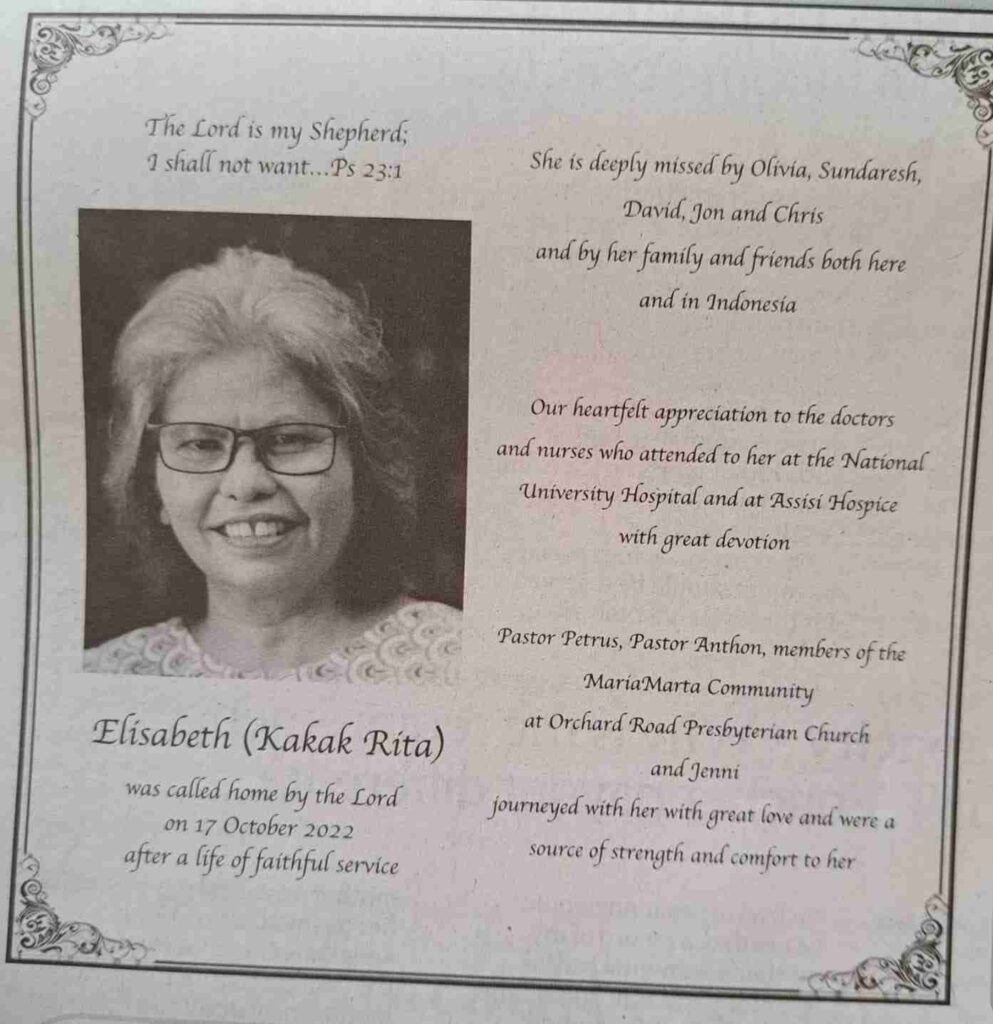 Home > Liturgi > Maria Marta > Liturgi Ibadah Penghiburan (Wake Service): Elizabeth Rita