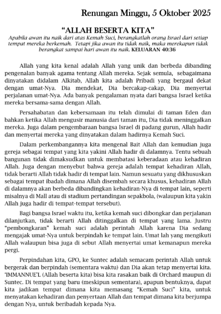 “Jemaat yang terkasih, kami sampaikan warta minggu Gereja Presbyterian Orchard untuk tanggal 5 Oktober 2025 , Jemaat dapat membaca melalui pdf dibawah ini.”